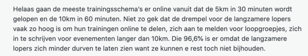 En inderdaad: op Prorun stoppen de tips en artikelen bij 5 kilometer in een halfuur of 10 kilometer in een uur. De redenatie was: de meeste lopers doen tussen 35 en 60 minuten over een tien kilometer. Lopers die korter dan 35 minuten of langer dan een uur over tien kilometer doen, vallen dus buiten de boot op Prorun.