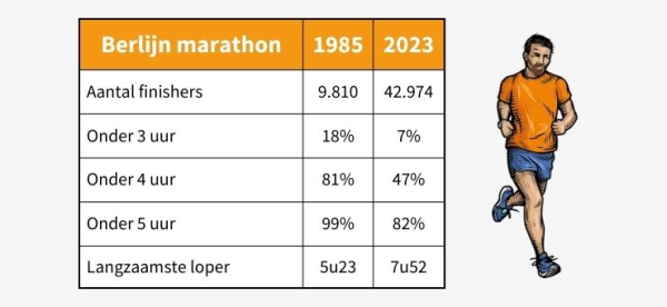 In de jaren tachtig liep 18% sneller dan drie uur en 1% langer dan 5 uur. Vorig weekend liep 7% sneller dan drie uur en 18% langer dan 5 uur.