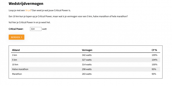 Mijn Stryd geeft na de 5000 meter een update van mijn Critical Power (CP), het omslagpunt met vermogen. Mijn CP is 314 watt.