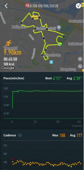 De hartslagmeting is, net zoals met andere optische hartslagmeters op de pols, niet altijd zo nauwkeurig als hierboven. Bij het lopen van korte tempo’s, sprints en dergelijke, is er vaak wat onnauwkeurigheid in de meting. Het horloge moet tijdens de meting echt goed tegen de huid aan zitten. Dit gezegd hebbend: ik kreeg tijdens mijn testrondje (Run Winschoten 10k) exact dezelfde hartslaggrafieken uit mijn Garmin 645 en de PACE.