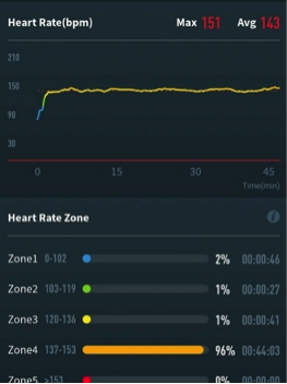 Hardlopen: bediening is gemakkelijk. Modus kiezen (hardlopen), rechtsonder knop indrukken en start. Elke kilometer een tussentijd; apart scherm voor hartslagmeting. Na thuiskomst de app openen: een bekend parcours. Snelheid wordt aangegeven, enigszins onduidelijk omdat de beginsnelheid van nul bij deze loop ook in de schaling is meegenomen. Pasfrequentie (cadence) wisselt wat, misschien door wind invloeden. Ernaast hartslag, zoals te zien keurig gemeten, en opgedeeld in hartslagzones. Nadere analyse van loopprestaties, een “Running Dynamics Analysis” is nog iet beschikbaar maar is aangekondigd.