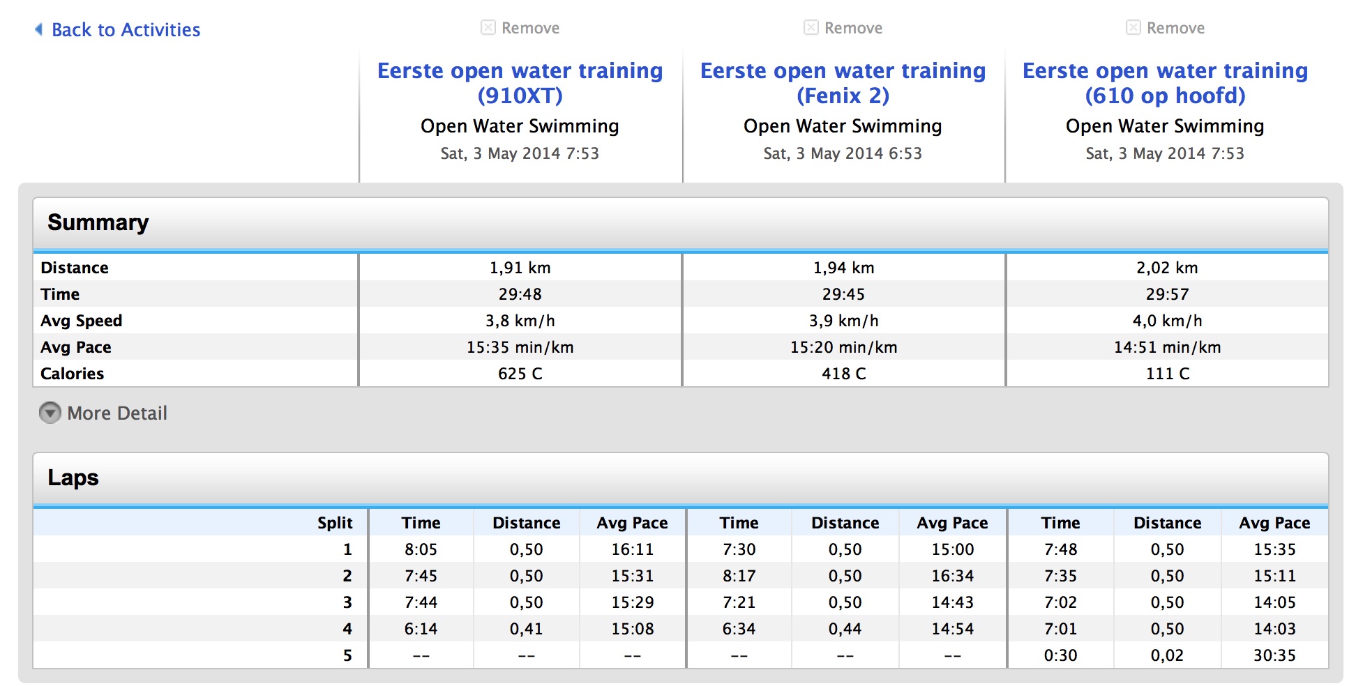 Ook kun je met de Fēnix in open water zwemmen. Er is met zwemregistratie iets meer afwijking dan gebruikelijk. Dit komt omdat onder water het GPS signaal niet geregistreerd wordt. Op basis van ervaringen kan ik zeggen dat de betrouwbaarheid behoorlijk groot is. Ter illustratie een weergave van een zwemtraining die ik gedaan heb met de 910XT, de Fēnix en op mijn hoofd een 610 ter controle. Te zien is dat ze alle drie dezelfde eindafstand hebben maar dat de interval tijden verschillen.