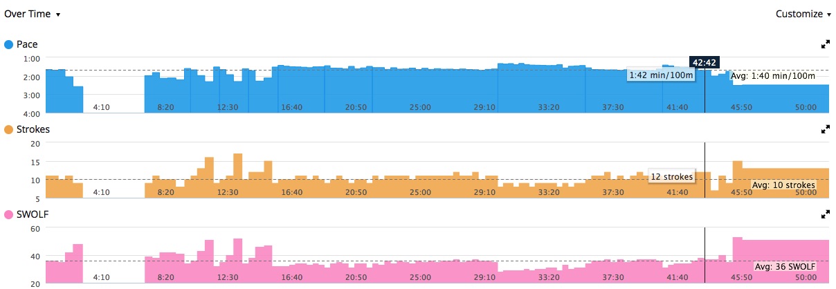 Als je gaat zwemmen dan kan de Fēnix alles wat de Garmin 910XT ook al kon. Dus afstand bijhouden, zwemslag herkennen, slagfrequentie, slaglengte etc. Dat gaat meestal goed maar niet altijd. Als je op een druk uur zwemt en je moet plotseling uitwijken voor iemand dan ziet de Fēnix dat ook als een keerpunt. Maar in zeker 95% van de trainingen had ik een correcte weergave van de trainingsafstand.