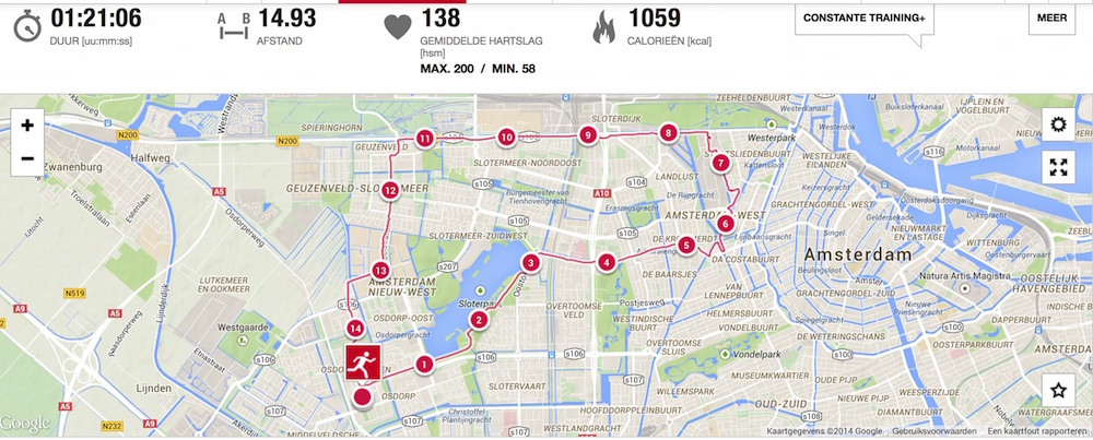 De V800 kan ook een aantal ‘running dynamics’ registeren, daarvoor moet echter wel een aparte stridesensor worden aangeschaft. Het voordeel hiervan is dat je ook je oude hartslagband kunt blijven gebruiken met de nieuwe V800, maar een flink nadeel is toch wel dat je, als je meerdere schoenen hebt, je de stridesensor steeds moet omzetten. Dat gaat niet heel makkelijk omdat de deze door de veters moet worden geregen, nog afgezien van het feit dat het kan zijn dat je er niet aan denkt. Op de hieronder getoonde afbeelding zie je een weergave van de gemiddelde en maximale pasfrequentie per minuut. Bedenk wel dat je het getal met twee moet vermenigvuldigen.
