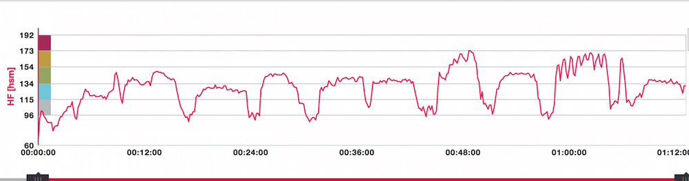 De V800 heeft één functie die hem uniek maakt, en dat is dat hij ook de hartslag registreert tijdens het zwemmen. Voor zover mij bekend is er geen ander GPS sporthorloge die dat kan. Bedenk wel dat om de HF-band op zijn plaats te houden je moet zwemmen met een badpak, triathlonpak of wetsuit. Met alleen een zwembroek verschuift de band om een goede registratie te garanderen. Hieronder zien we een perfecte HF-registratie gemaakt tijdens een openwater zwemtraining.