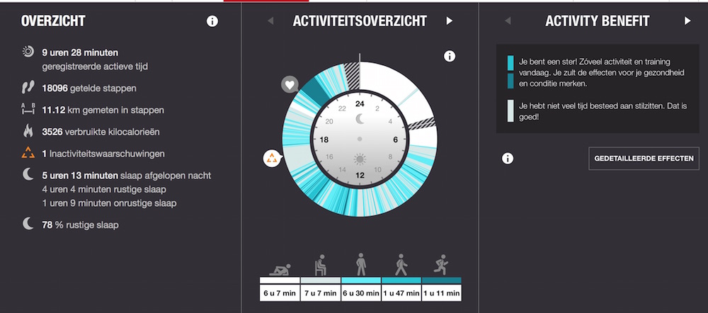 Waar de V800 echt in uitblinkt is de activity-tracker. Je krijgt elke dag een compleet overzicht van al je activiteiten (behalve helaas op je stadsfiets fietsen zonder HF-meter), inclusief een overzicht van hoe lang en goed je geslapen hebt. Dit is bv. er interessant voor (personal) trainers die hiermee op afstand een goed beeld kunnen krijgen van hoe hun atleten die dag zich gedragen hebben. Maar ook als je voor jezelf sport om gezond te blijven kun je hier veel informatie uithalen.