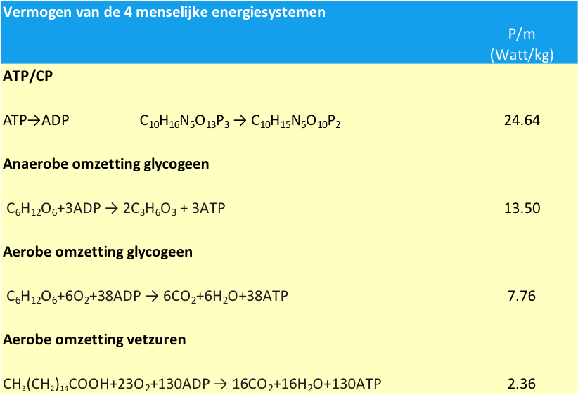 De getallen in de tabel zien we als het maximum vermogen dat mannelijke elite atleten kunnen leveren. Voor vrouwelijke elite atleten ligt dit zo’n 11% lager. Sorry dames, dit komt omdat vrouwen van nature een hoger vetpercentage dan mannen hebben. Ook als ze een afgetraind gewicht hebben.