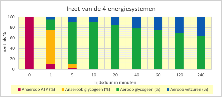 In de figuur hebben we de bijdragen van de 4 verschillende energie systemen afhankelijk van de duur van je wedstrijd inzichtelijk gemaakt. Sprinters maken voornamelijk gebruik van ATP als brandstof. Een 400 m en een 800 m hardloper moet het vooral hebben van de anaerobe omzetting van glycogeen. Lange afstand lopers maken gebruik van de aerobe omzetting van glycogeen en vetzuren. Dit betekent dus dat naar mate een wedstrijd langer duurt de haalbare snelheid lager wordt. Deze verschuiving van de brandstofmix is de verklaring van de Formule van Riegel. Deze formule wordt in heel veel calculatoren op internet gebruikt om je tijd op andere afstanden te voorspellen op basis van een gelopen tijd.