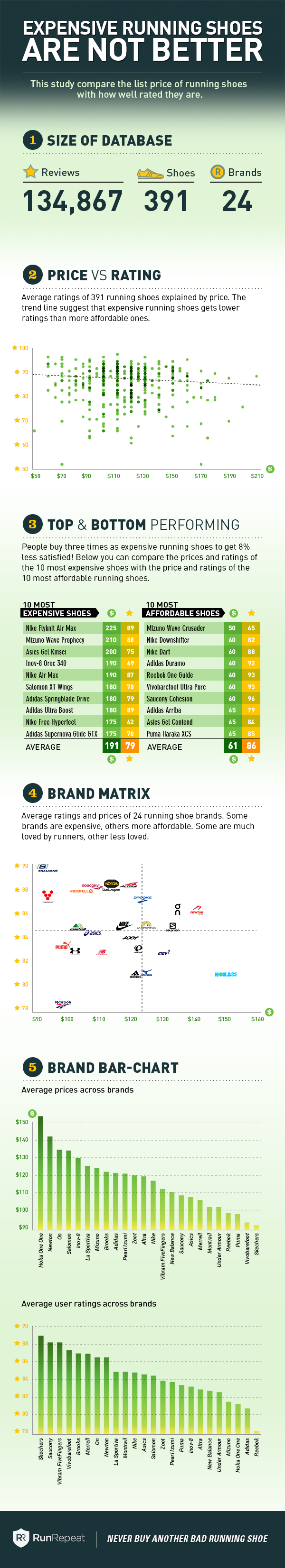 Als we het beste willen, moeten we investeren. Dat wordt altijd gezegd. Of: goedkoop is duurkoop. Toch blijkt dat niet op te gaan wanneer we het over de aanschaf van nieuwe hardloopschoenen hebben. Onlangs zijn er bijna 135.000 (134.867 om precies te zijn) beoordelingen van gebruikers bekeken en daaruit blijkt iets ‘schokkends’: hoe hoger de prijs, hoe lager de score. Het is zelfs zo dat de tien duurste loopschoenen (gemiddeld 225 euro) ongeveer 8 procent lager scoorden dan de tien meest betaalbare loopschoenen (gemiddeld 75 euro). Dat zegt ook Jens Jakob Andersen van RunRepeat.com.