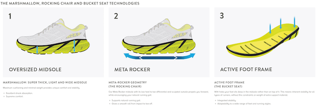 Aan de andere kant kwam er een andere ontwikkeling op gang die zo ongeveer het tegenovergestelde was van de minimal golf: maximal, high cushioning, fat en energie teruggave. Hoka One One behoort overduidelijk tot deze categorie en ondertussen heeft het merk een hele range aan schoenen op de markt gebracht. Van schoenen voor training tot wedstrijd en van weg tot trails, maar allemaal met dezelfde opvallende dikke zool.