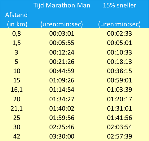 Het effect van bloeddoping en EPO op de VO2 max is zoals gezegd zeer groot, namelijk 10-15%. Het effect op de loopprestaties is navenant groot. De tabel en grafiek laten zien dat onze Marathon Man hierdoor in een hele andere klasse terecht zou komen. Zijn tijd op de marathon zou kunnen verbeteren van 3:30 naar 2:57! Het is dan ook geen wonder dat het bij de wielrenners de afgelopen jaren onbegonnen werk was om als schone renner te concurreren met dopinggebruikers!