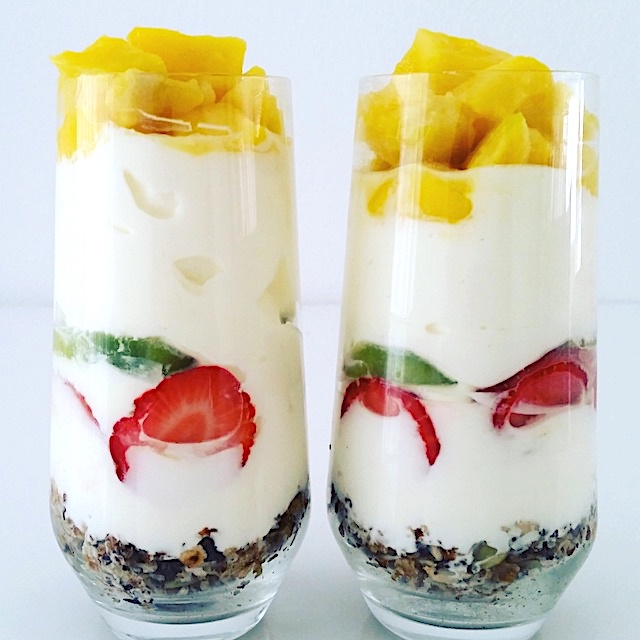 -Dan komt het leukste, namelijk het opmaken van het ontbijt. Schep eerst wat granola in een glas. Dan een beetje Griekse yoghurt, wat fruit en zo ga je door. Laagje voor laagje: tot je een feestelijk zomers ontbijt hebt.