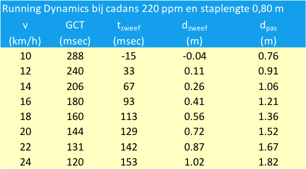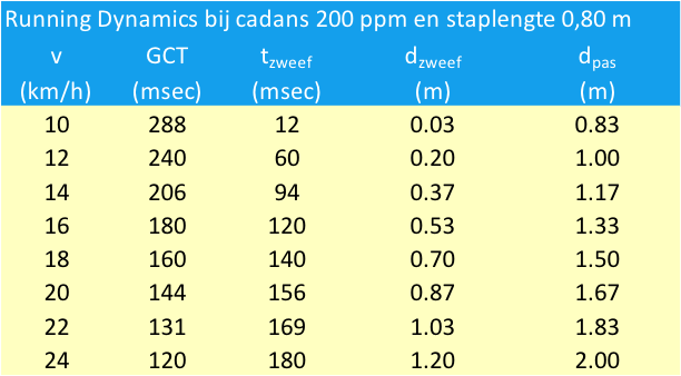 Met het model van de loopbeweging hebben we 4 tabellen gemaakt. Ze gelden voor 4 verschillende waarden van de cadans, namelijk 160, 180, 200 en 220 ppm. De cadans is immers de parameter die je relatief het makkelijkste kunt beïnvloeden. Als voorbeeld nemen we de loper die we eerder ook gebruikten. Als hij zijn cadans zou verhogen van 160 naar 180 ppm en zijn snelheid constant blijft op 12 km/h, veranderen zijn Running Dynamics als volgt: