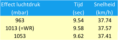 De dichtheid van lucht p (in kg/m3) op zeeniveau wordt bepaald door de luchtdruk en de temperatuur. Als de luchtdruk echter lager is dan 101.300 Pa (1013 mbar) is ook de dichtheid van de lucht lager en kan Usain in principe sneller lopen! Het omgekeerde is natuurlijk het geval bij hoge luchtdruk. We hebben aangenomen dat Bolt het wereldrecord gevestigd heeft bij een luchtdruk van 1013 mbar en hebben onderzocht wat er zou gaan gebeuren als de luchtdruk daalt tot 963 mbar of stijgt tot 1053 mbar. Zoals weergegeven in de tabel zou Bolt bij een lagedrukgebied 0,04 seconde sneller kunnen lopen dan hij in Berlijn gedaan heeft.