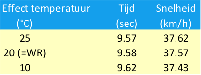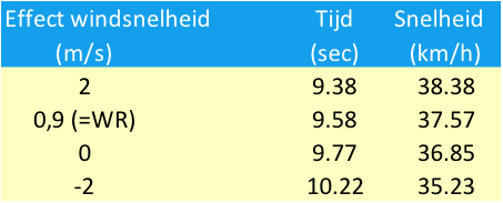 Dit effect is voor de praktijk zeer relevant, vandaar ook dat records alleen erkend worden bij een maximale rugwind van 2 m/s. In Berlijn had Bolt al het geluk van een rugwind van 0,9 m/s, dus dat hebben we in de berekeningen meegenomen. In de tabel hebben we uitgerekend hoeveel effect de windsnelheid op zijn tijden heeft. Met de maximale rugwind van 2 m/s had Bolt dus nog 0,20 seconde sneller kunnen lopen!