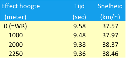 In de bergen neemt de luchtdruk af met de hoogte. In Mexico-City (hoogte 2250 meter), is de luchtdruk dus circa 76,6 % van de luchtdruk op zeeniveau. We hebben berekend wat de haalbare tijd voor Bolt wordt als hij op een hooggelegen baan zou lopen. Zoals de tabel toont, zou hij in Mexico-City (gelegen op 2250 meter boven zeeniveau) een tijd kunnen lopen van 9.36 seconden, ofwel 0,22 seconde sneller dan in Berlijn!