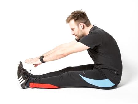 Een andere manier is, om zittend op een stoel, de rug in het lumbale (onderste) deel hol te maken, de benen zoveel mogelijk te strekken en dan voorover te buigen.
