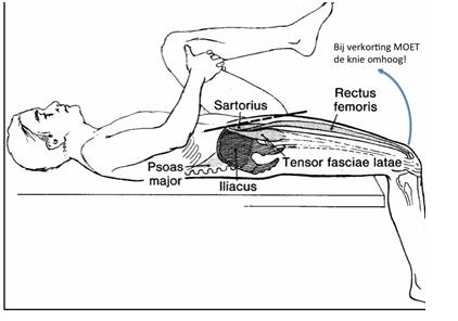 Als je, liggend op de tafel, het gebogen been (op het plaatje het linker) niet meer dan 90 graden kunt buigen, zonder dat de knie van het andere been mee omhoog gaat, dan zijn flexoren verkort. Als alleen de iliopsoas verkort is, blijft de knie ongeveer in 90 graden flexie. Als ook de rectus femoris verkort is, beweegt het onderbeen wat naar de knie. Meestal zijn zowel de iliopsoas, als de rectus femoris verkort en moeten die twee dus door rekoefeningen weer op lengte gebracht worden.