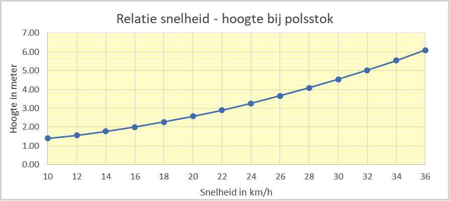 Bij het polsstokhoogspringen is het belangrijk om voldoende snelheid te maken in je aanloop. Tijdens die aanloop bereik je een hoeveelheid kinetische energie die je omzet in de potentiele energie van de hoogte die je bereikt. Bij een perfecte techniek kun je de energie uit je aanloop vrijwel volledig omzetten. In de figuur laten we zien welke hoogte je bij welke aanloopsnelheid kunt bereiken.