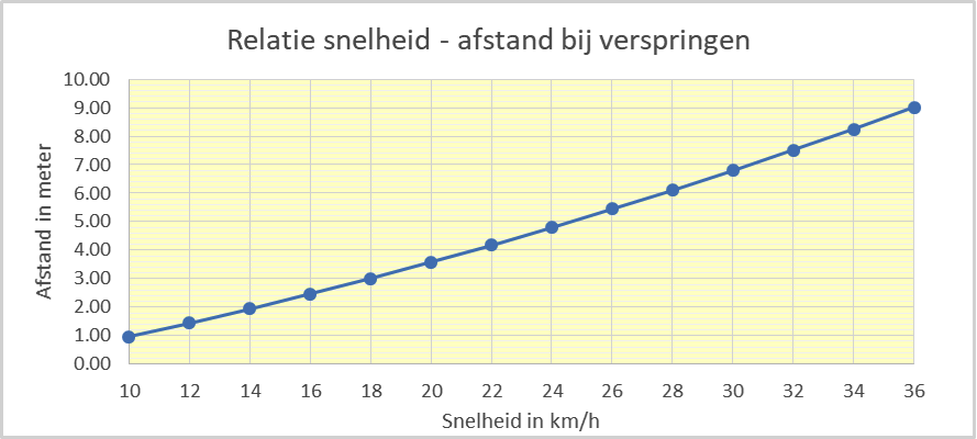 Bij het verspringen is het ook heel belangrijk om voldoende snelheid te maken in je aanloop. Bij de afzet zet je een deel van je horizontale snelheid om in een verticale snelheid. Door die verticale snelheid ga je een kogelbaan maken. Hiermee kan de springafstand berekend worden. Voor verschillende snelheden hebben we de afstand bij een technisch perfecte sprong in de figuur weergegeven.
