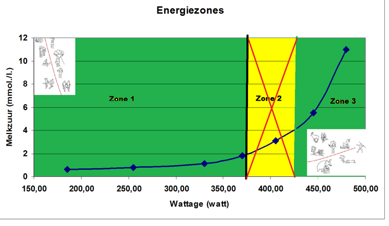 Louis presenteert onderstaande figuur: drie energiezones, met daarin een lactaatcurve. Door zone 2 een groot kruis: tegenwoordig is gepolariseerd trainen een veelgebruikte aanpak. Train hard of zacht, train niet grijs.
