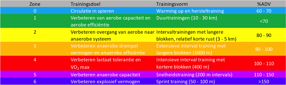 Nu je je ADV hebt bepaald, kun je hiermee je trainingszones gaan indelen. Op basis van de literatuur en onze eigen ervaring hebben we 7 verschillende zones (0 – 6) gedefinieerd voor de training van de energiesystemen van je menselijke motor:
