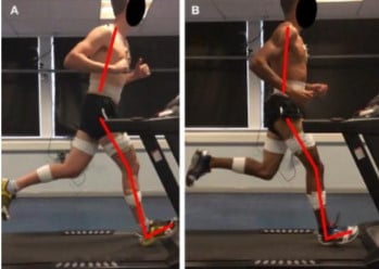 In bovenstaand onderzoek van Bramah (2) zie je dat de kniehoek groter (foto B) is naarmate de staplengte groter is. Als je goed kijkt zie je ook dat de loper meer rechtop loopt. Dus door wat meer naar voren te hangen maak je automatisch je staplengte wat kleiner.